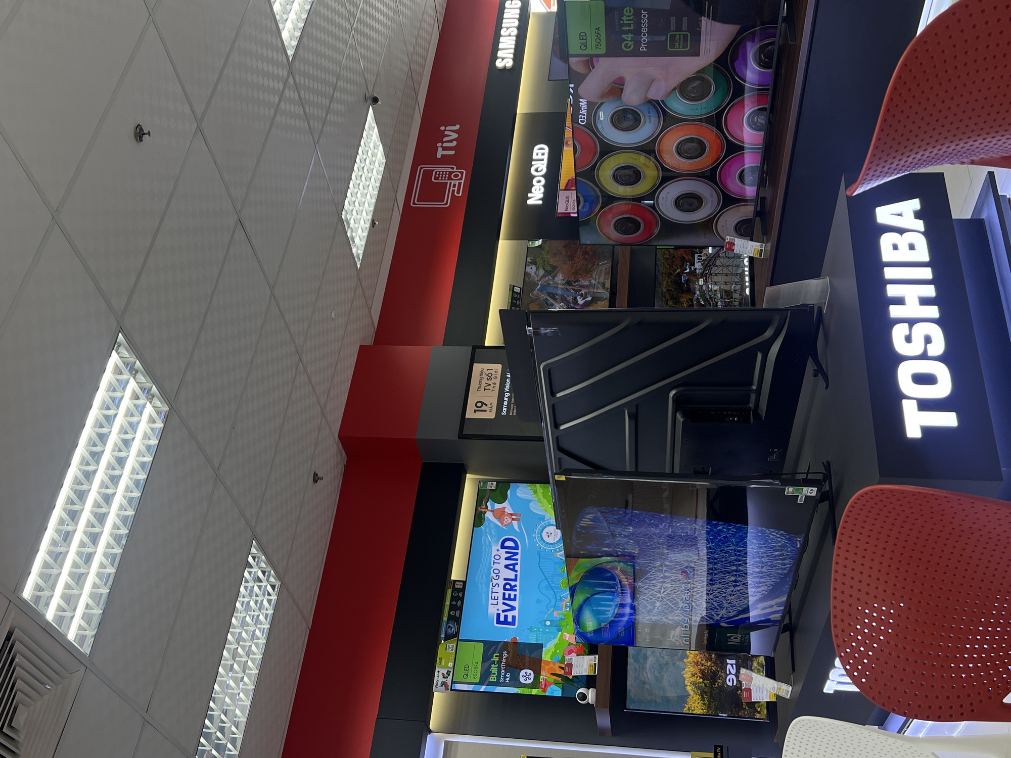 selection of televisions on display in a store located in Nha Trang, Vietnam. Brands prominently featured include Toshiba, Samsung, and Tivi. A red wall with the "Tivi" logo is visible. Several television models are on display, including Samsung's Neo QLED and models displaying images like "Let's Go to Everland". Red and white chairs are positioned in front of the TVs, suggesting a viewing area. The store's ceiling has a grid-like design with bright, long, recessed lights. Signs and promotional materials provide details about the TVs' features, such as QLED technology and built-in smart capabilities. The setting is clearly a retail environment for consumer electronics.