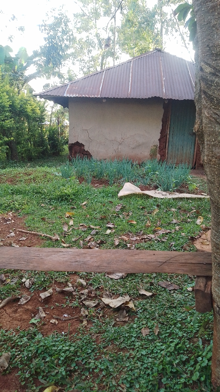 This image depicts a rural or semi-rural outdoor scene in Kisa Central ward, Kenya. The primary subject is a small, single-story rectangular building positioned centrally in the midground. Its walls are a light beige or off-white, constructed from what appears to be mud or rough plaster, with visible cracks and areas where reddish-brown material is exposed. The roof is made of weathered, rusted corrugated iron. A green-painted wooden door is situated on the right side of the building's visible facade. In the foreground, a rough-hewn horizontal wooden beam or fence rail extends across the lower portion of the frame, partially obscuring the ground. To the right of this beam, a portion of a thick tree trunk with textured bark is visible. The ground immediately in front of the building and behind the wooden beam consists of reddish-brown soil mixed with patches of green ground cover and scattered dry, brown leaves. Directly in front of the building, a cultivated patch of tall, thin-leaved green plants, possibly spring onions or similar vegetables, grows in a neat row. To the right of this cultivated patch, a crumpled, light-colored plastic sheet or bag rests on the grass. The background features dense green foliage from various trees and shrubs, indicating a vegetated environment. The sky is bright and appears overcast or filtered by leaves, suggesting daylight conditions. No people or animals are visible, and no specific actions or interactions are depicted.