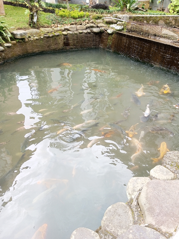 A pond teeming with koi fish of varying colors, including orange, yellow, and white, fills the frame. The murky water reflects the sky, obscuring the bottom. The pond is enclosed by stone borders, with lush greenery visible in the background. A small waterfall feature is present on one side, adding texture to the scene. The overall composition creates a sense of serenity and nature.