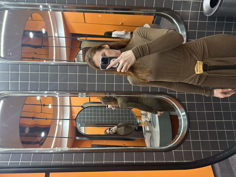 The scene depicts a female taking a mirror selfie inside a public restroom or changing area in Licheng District, China. The primary subject stands centrally, partially obscuring her face with a smartphone held in her right hand, which is encased in a clear protective cover. She wears a long-sleeved, high-neck, olive-brown form-fitting dress featuring a cinched waist with a light-colored rectangular buckle or label. Her long, reddish-brown hair is visible over her shoulders. The immediate background wall behind the photographer is covered in dark gray square tiles with white grout lines. Two tall, vertical, oval-shaped mirrors with black frames are prominent in the foreground, reflecting the subject and the environment. In the reflection within these mirrors, beyond the subject, the walls transition to a vibrant orange. A light gray counter with two sinks, two faucets, and a small decorative vase containing minimal foliage is visible in the reflection. Further back, also in reflection, another individual, possibly female and wearing a light-colored top, is partially visible against the orange wall. The ceiling, visible in the reflections, is curved and orange, featuring multiple recessed light fixtures. A metallic trash receptacle with a black lid is partially visible on the lower right of the foreground.