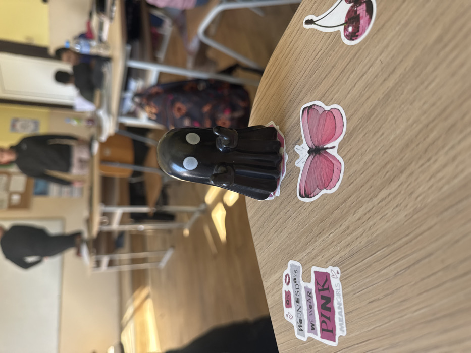 This image depicts the interior of a classroom located in the city of Cherven Bryag, Bulgaria. The foreground shows a light-colored wooden desk surface featuring a small, black, glossy ghost-shaped figurine with two white circular eyes and raised hands. To the left of the figurine, a rectangular sticker reads "ON WEDNESDAYS WE WEAR PINK MEAN GIRLS." A pink butterfly sticker is positioned directly below the ghost, and a partial view of a pink cherry sticker is visible to the right. The midground, largely out of focus, contains multiple light-colored wooden desks and chairs. Several individuals are present: one person stands on a desk on the left, facing away; another person, wearing a dark hoodie and light pants, stands further back in the center. To the right, two students are seated at a desk, with a clear water bottle on their surface. A colorful, patterned backpack is discernible beneath a desk on the right. The background features light-colored walls, with a whiteboard partially visible on the left and additional items affixed to the wall on the right. Strong natural light enters the room from the left, casting distinct shadows of the furniture and people onto the wooden floor.