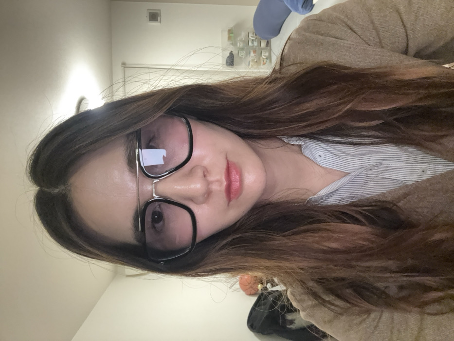 An image captured in Setagaya, Japan, presents a female individual positioned centrally, facing directly forward. She has long, dark brown hair with a central part, falling over her shoulders. Her facial features are partially obscured by oversized aviator-style eyeglasses, featuring thick black frames, a silver double bridge, and faded pink-tinted lenses through which her eyes are faintly visible. Her mouth is closed, with a light application of lip color. She is attired in a light-colored pinstriped collared shirt, worn underneath a beige, open-front cardigan. The background on the left side of the frame reveals dark, indistinct objects, possibly textile or bag fragments, and a single orange spherical object. To the right, a plain white wall is visible, featuring a small white rectangular control unit (possibly a thermostat or intercom panel) mounted high on the wall. Below this, a clear acrylic multi-tiered shelving unit displays several small, light-colored ceramic bowls or cups. Further to the right, a blue cylindrical bolster pillow is partially visible, resting on an unidentified light-colored surface. The lighting is consistent with an indoor environment. The individual's direct gaze is fixed on the camera.
