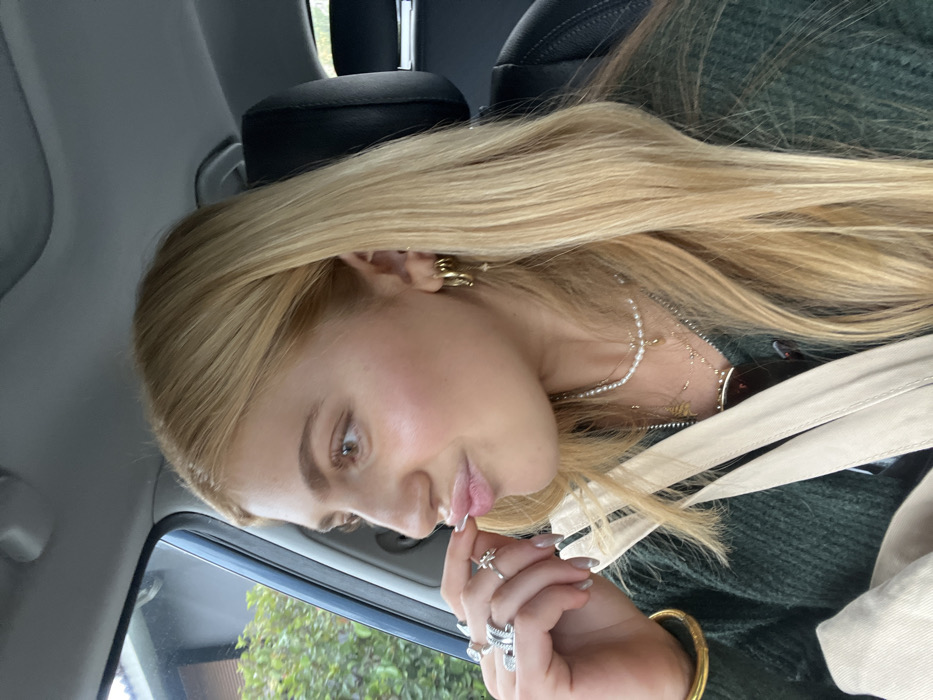 A young adult female is depicted seated inside a vehicle, located in Interlomas, Mexico. She has long, straight blonde hair, a fair complexion, and light brown eyes, with a slight rosiness on her cheeks. Her lips are pursed in a pouting expression, with her left thumb and index finger lightly touching her lower lip. She wears a dark green top, and a beige strap, likely a seatbelt or bag strap, crosses diagonally over her chest. Her left hand features multiple rings, including a prominent silver-toned starburst ring on her middle finger and a gold-toned bangle on her wrist. Her right ear is adorned with multiple gold hoop earrings and a delicate charm. Layered necklaces, including a pearl choker and several gold chains with pendants, are visible. The car's interior includes a light gray ceiling and a dark headrest. Through the car window, blurred green foliage and a portion of a light-colored building are visible in the background.