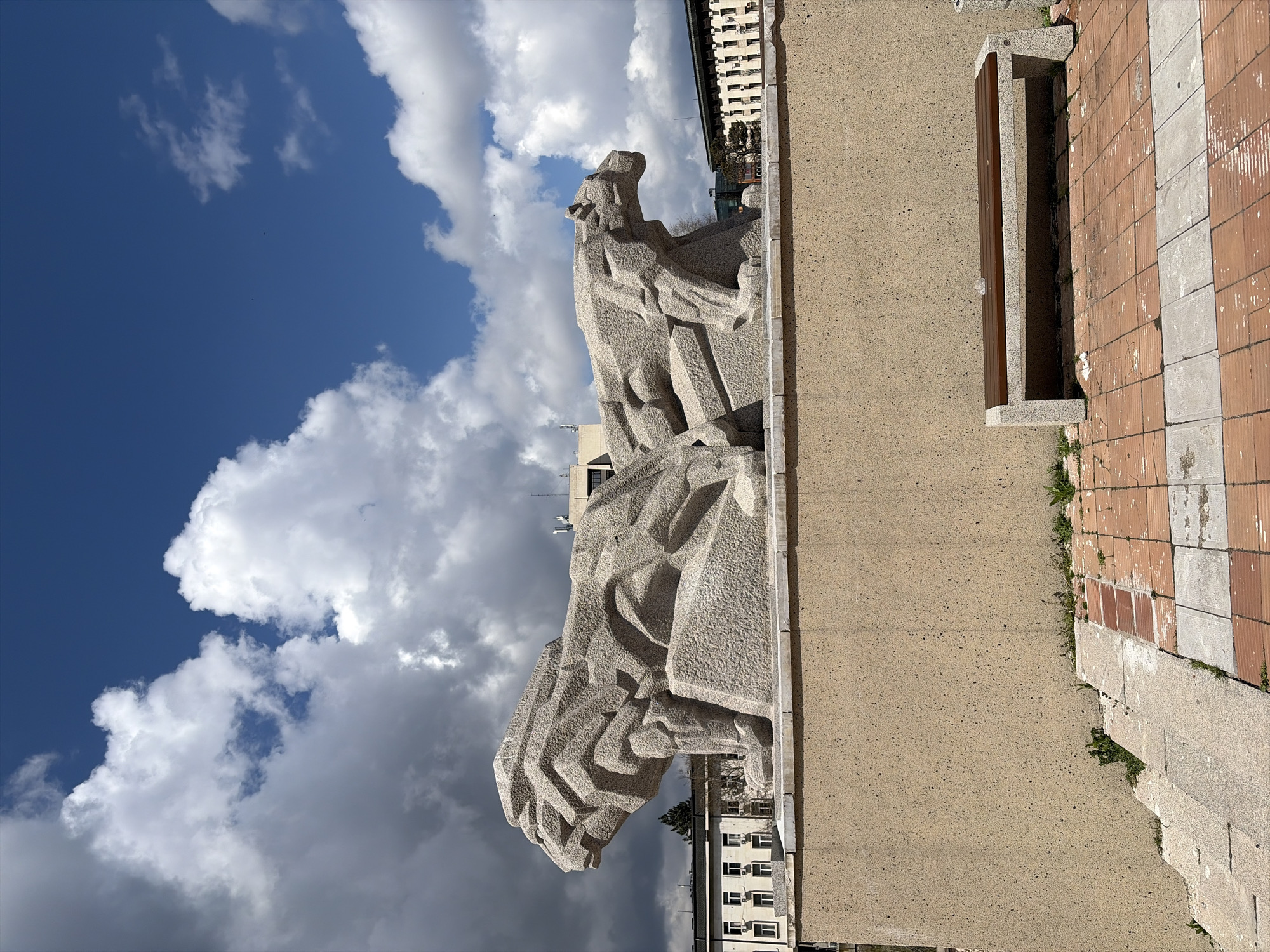 large, abstract stone monument depicting a man and a horse. It is a bas-relief attached to the side of a light-colored building. The monument is located in Lovech, Bulgaria. In the background, a building with rows of windows is visible. The sky is partly cloudy, with blue sky visible among the white clouds. To the right, there is a walkway with a bench. The walkway is paved with brown and grey tiles. Some greenery, like small plants, can be seen along the edge of the walkway.