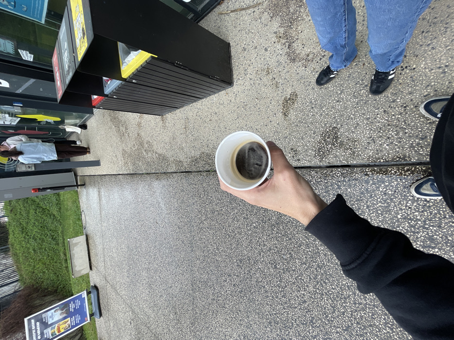 An overhead-angle photograph captures an outdoor scene at a commercial or public location in Bron, France, under overcast lighting. In the immediate foreground, a person's left hand, wearing a black long-sleeved garment, holds a white paper cup containing a dark liquid. The feet of two individuals are visible on a speckled grey aggregate pavement: one pair at the bottom of the frame, wearing dark blue and white sneakers; another pair to the right, wearing black and white sneakers and blue jeans. Further back, two individuals stand near a dark building facade with yellow accents and a glass panel. One person, seen from behind, wears a light blue shirt and dark brown trousers. Adjacent to them on the right are three black vertical slatted recycling bins with red, grey, and yellow-colored top openings. To the left, a blue A-frame sign with yellow graphics displays French text, including "COMPRES GROUPES OU IMAGES," and images. Behind the sign is a rectangular concrete planter, followed by a grassy embankment. The pavement surface exhibits a linear demarcation, with the left side appearing slightly darker or damp.