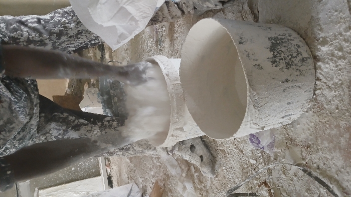 Location: Unknown, Unknown. A close-up, low-angle photograph captures a male individual with dark skin, visible from the mid-torso down, actively mixing a white powdery substance. The individual is wearing dark trousers and a dark short-sleeved top, both heavily splattered with white powder. Their bare forearms and hands are submerged in a white plastic bucket, vigorously stirring its contents, causing a significant cloud of white dust to rise. A second, identical white plastic bucket, partially filled with the same white powdery substance and coated in dust, is positioned in the foreground. On the left, a light-colored, perforated clog-style shoe, covered in white powder, is visible on the individual's left foot. To the right, a large white bag, likely containing the powdery material, rests on the dust-covered floor. The entire visible floor and surrounding surfaces are thickly coated in white powder and construction debris, indicative of a worksite.