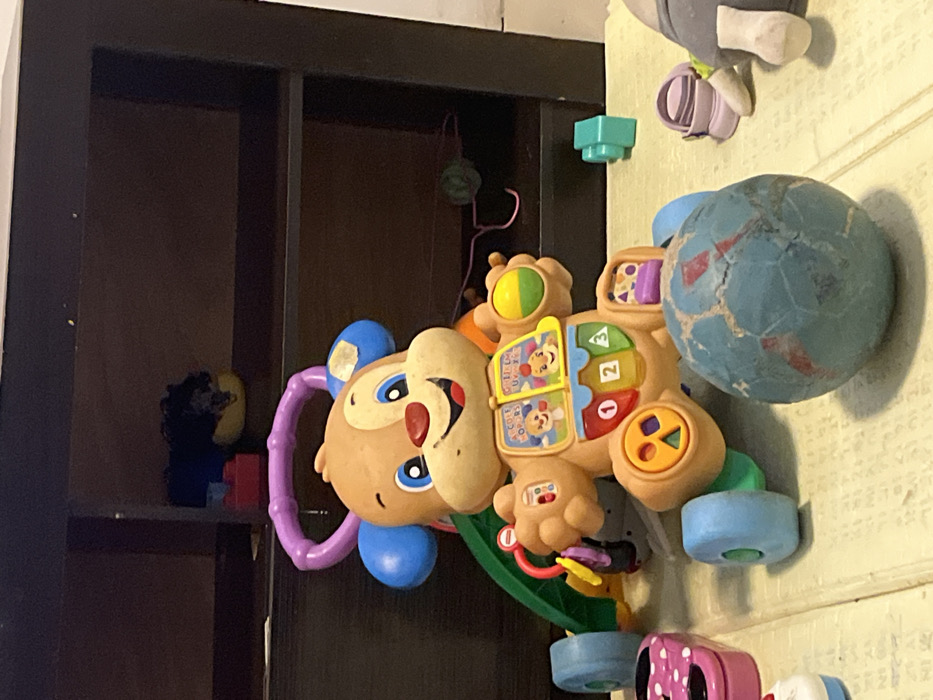 A child's toy, a light-brown bear-like figure with buttons and interactive elements, is positioned in the foreground, seemingly attached to a green arch. Various other toys, including building blocks and a cracked blue ball, are scattered nearby. The backdrop features a dark-brown shelving unit on one side and a light-colored wall on the other, indicating an indoor environment.
