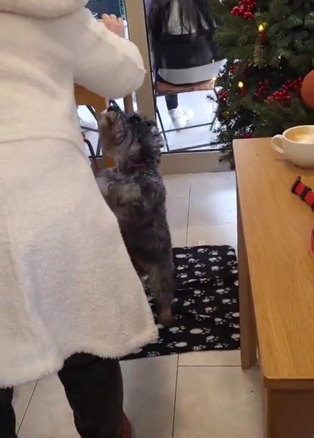 woman and a small, dark-haired dog indoors. The woman is wearing a white, fluffy robe and brown shoes. The dog is standing on a black mat with white paw prints, looking up at the woman. The woman is giving the dog commands, and the dog eventually sits. In the background, a Christmas tree stands next to a table with a cup of coffee, a leash, and a smartphone on it. Through the glass doors behind the woman, there are people sitting at tables outside.