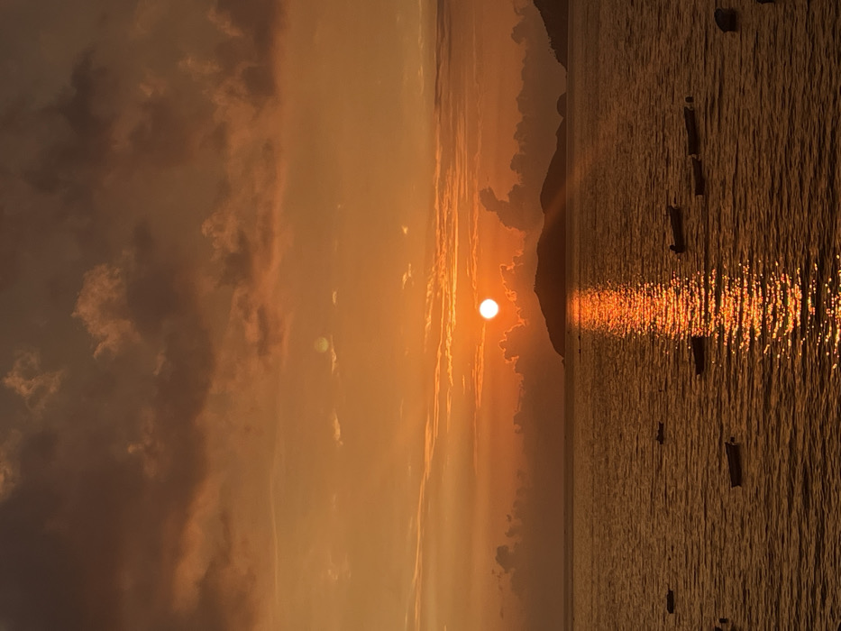 An amber sunset paints a tranquil seascape. The sun, a radiant orb, casts a fiery glow on the calm waters. Reflections shimmer across the surface, interspersed with dark, floating objects. Soft clouds drift above, tinted with shades of orange and gold. A silhouette of a distant landmass adds depth to the scene. The image exudes warmth and serenity.