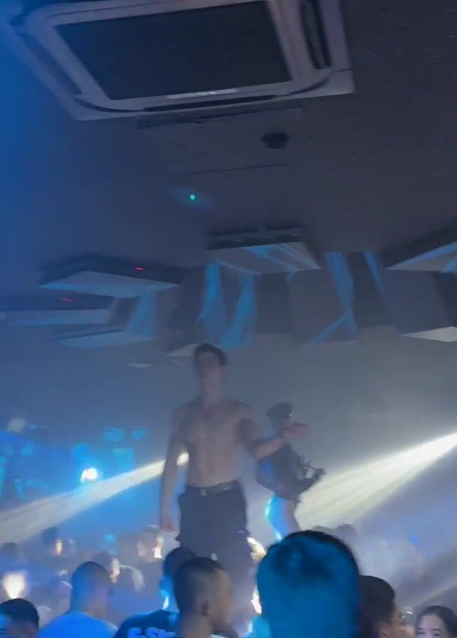interior of a nightclub. The club is dimly lit with blue lights and a fog machine, creating a hazy atmosphere. There are several people on the dance floor, silhouetted against the lights. Two male dancers are visible on a raised platform at the front of the room. One dancer is shirtless and wearing dark pants, while the other is dressed in red and white attire and wearing a hat. The camera is positioned from the perspective of someone in the crowd, looking up at the stage. Air conditioning vents are visible on the ceiling above the dance floor.