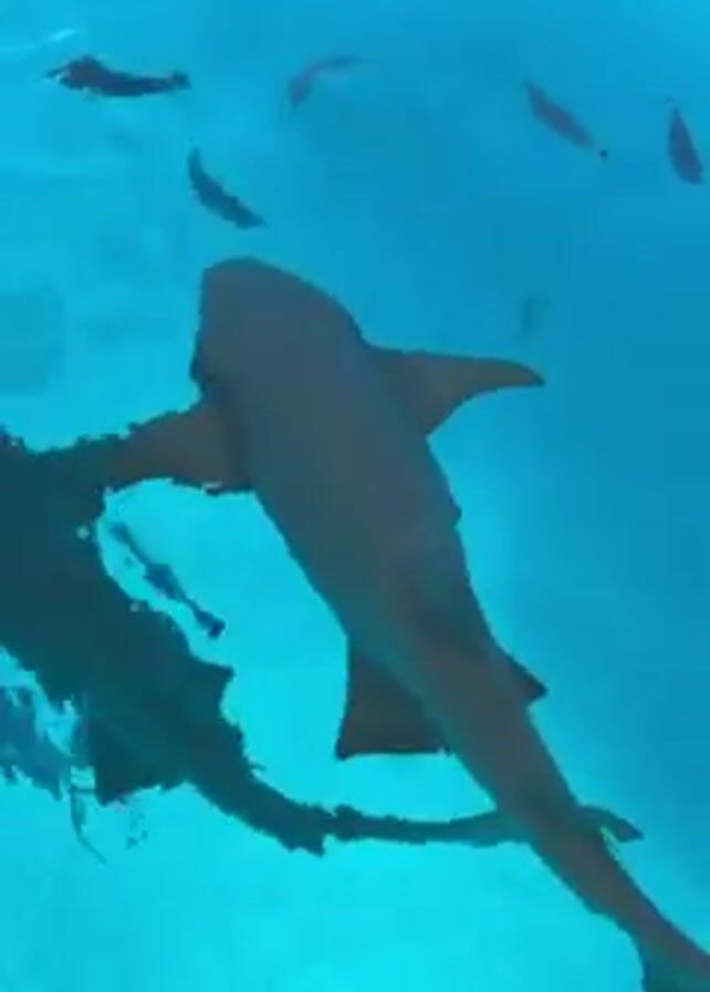 shark swimming in clear, turquoise water. There are a few smaller fish around it. The shark is brown and its shadow is visible on the bottom of the water. Sounds of people talking are heard in the background.