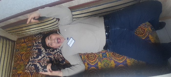- "The image displays an adult male, identified by a nametag as Riza Rahmon, lying supine on a patterned surface in an indoor location in Chinabad, Uzbekistan" by FM-sPYLJ2, licensed under CC BY 4.0