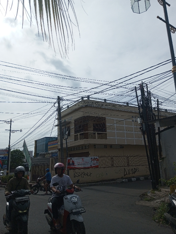 A street scene features two individuals riding motorbikes. One wears a helmet and a light-colored shirt, while the other is in a helmet and a darker shirt. Power lines crisscross overhead. Behind them stands a two-story building with a banner attached to its fence. The banner features a political advertisement. Graffiti decorates the lower portion of the wall. The sky is overcast. A palm frond is visible in the upper left corner.
