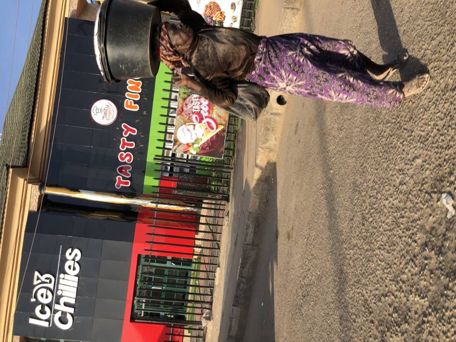 An adult female is observed walking left across a paved street in Kabong, Nigeria. She carries a black plastic basin balanced on her head and a dark bag slung over her left shoulder. She wears a brown long-sleeved top, a purple and black patterned wrapper, light-colored sandals, and a patterned headwrap. In the background, behind a black metal fence, are two commercial buildings. The building on the left features a red lower facade and black upper facade with white text "Ice & Chillies". The adjacent building on the right displays a green lower facade and black upper facade with red text "TASTY FINGERS" and a circular "Tasty Fingers" logo. Promotional posters, including one depicting ice cream, are visible near the establishments. The scene is illuminated by strong sunlight, casting shadows across the street.