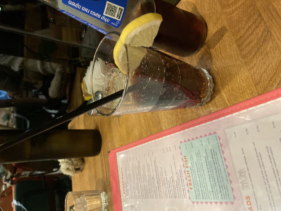 The image depicts a close-up, elevated view of a wooden table surface within what appears to be a restaurant or cafe in Hod HaSharon, Israel. In the immediate foreground, to the left, is a menu encased in a clear plastic sleeve with a pink border. Visible sections include "FRESH PASTA" and "FRESH FISH," with text in both English and Hebrew. To the right, a tall, clear glass contains a dark, carbonated beverage with ice and a lemon wedge attached to the rim. A black drinking straw is immersed in the liquid. Adjacent to this glass, a dark glass bottle containing a similar dark liquid is visible, with a blue and white label featuring Hebrew text and a QR code partially visible. Further back on the table, a smaller, clear glass containing water is present to the left. Centered on the table, behind the menu, is a tall, dark brown glass bottle. A small, light-colored, fluffy object, possibly a dog or a decorative item, is positioned behind this bottle. The background is out of focus, showing indistinct shapes of other patrons and furniture, suggesting an indoor dining environment with subdued lighting. Reflections are visible on the surfaces of the bottles and glass.