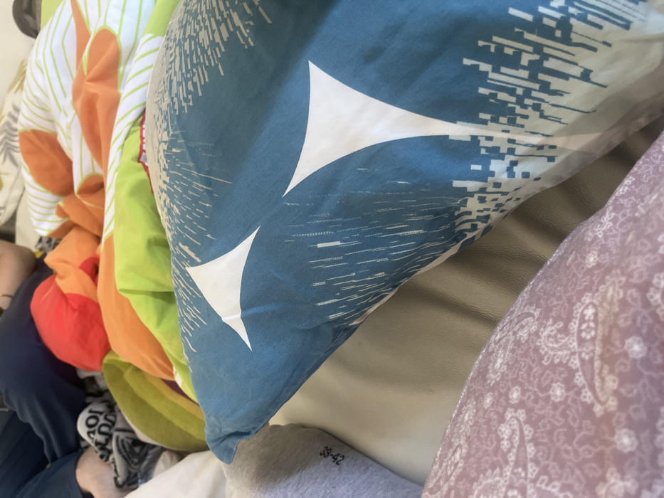 The scene depicts an interior setting, specifically a disheveled bed in what appears to be a bedroom in Tlaxcalancingo, Mexico. In the background, a person is partially visible, lying down and covered by a mix of colorful bedding including orange, bright green, white with green stripes, and red fabrics. The person's left arm, clad in a dark blue long-sleeved garment, is bent, and their head is obscured from view. To the left, a foot is visible, wearing a light grey sock marked with the numbers "39-42" vertically. In the mid-ground, a blue pillow with a distinct white geometric pattern of triangles and vertical, pixelated lines rests on a beige or light brown surface, likely a mattress or another part of the bed. The pillow appears slightly compressed. The foreground, at the bottom left, shows a portion of a light purple fabric with an intricate white paisley pattern, likely another piece of bedding or a blanket. The overall arrangement suggests the bed is currently occupied or has been recently used for rest.