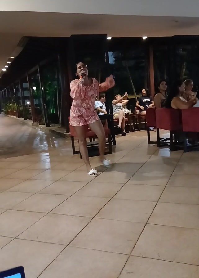 A woman is singing into a microphone at what appears to be an outdoor restaurant or hotel patio. She is wearing a pink floral romper and white sandals. She is standing and gesturing with her arms while singing. Several people are seated at tables behind her, watching her performance. The area is tiled and there are lights along the ceiling. In the foreground to the left, the top of a laptop screen is visible. Outside the patio, it looks like it has recently rained.