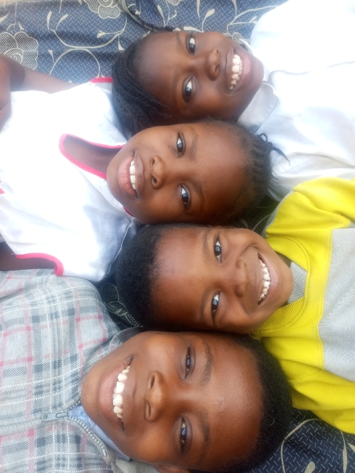 Four smiling young African girls are lying on their backs, heads close together, looking up at the camera. The first girl wears a white shirt and braided hair. The second wears a white shirt with red trim. The third wears a yellow and gray shirt, and the last is wearing a gray plaid jacket. They are all smiling, showing their teeth, and their faces are brightly lit. The background appears to be a patterned bedspread.