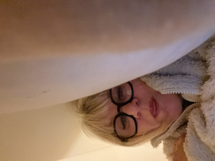 A person with blonde hair and glasses peers from under a white object, likely a sheet or blanket. They are wearing a fluffy, light-colored jacket or robe. Their face is partially obscured, but their eyes, nose, and lips are visible. The background is a light, neutral color, possibly a wall or ceiling. The overall impression is that the person is hiding or lying down under something.
