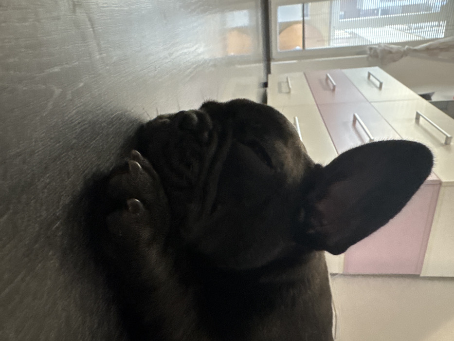 - "The image depicts a dark-colored French Bulldog sleeping on a dark gray laminate floor within a domestic interior in Varna, Bulgaria" by FM-wRUHr1, licensed under CC BY 4.0