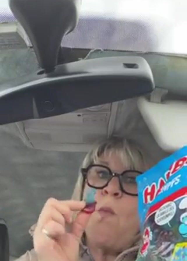 A woman is sitting in a car. She is holding a Smurf-shaped gummy candy in one hand and a bag of Haribo Smurfs in the other. She is eating the gummy. She is wearing glasses and a tan jacket. The car's rearview mirror is visible in the background.