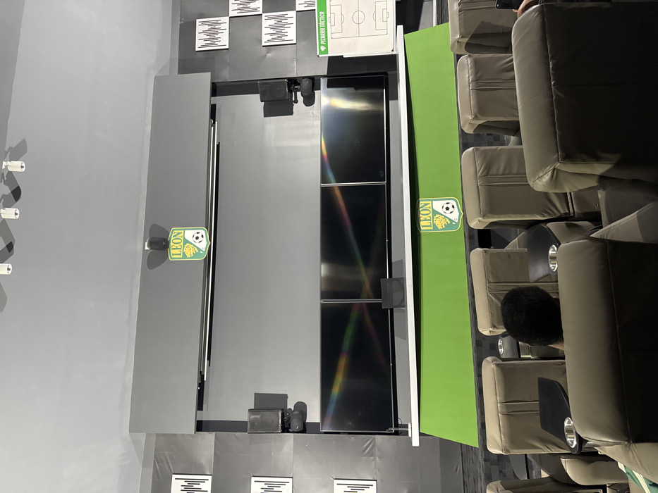 A lounge with rows of recliner seats and a large screen. The screen displays three stacked monitors. A green panel with the Leon soccer club logo stands between the screen and the chairs. A matching Leon logo is visible on a gray wall to the left. Above the screen are a tactical board and wall decorations. The gray carpet has a checkered pattern.