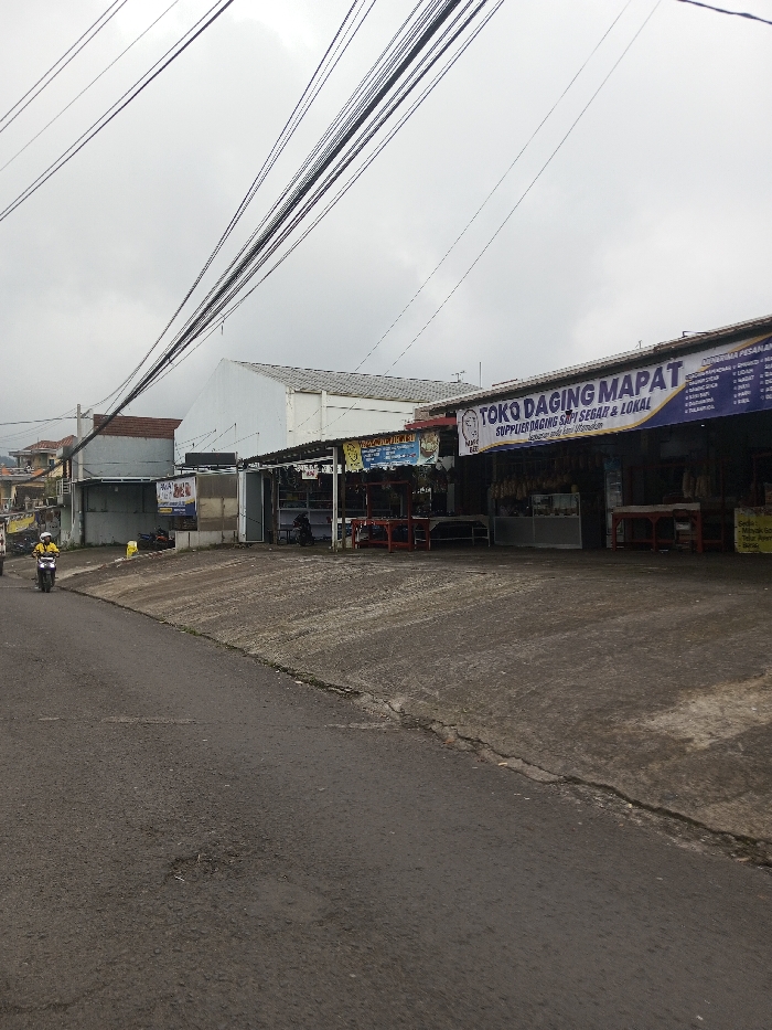 The image displays an overcast street scene, indicating a commercial area. The visible signage, specifically "TOKO DAGING MAPAT" and "SUPPLIER DAGING SAPI SEGAR & LOKAL" in Indonesian, is inconsistent with the specified location of Sandamal Eliya, Sri Lanka, and strongly suggests the scene is located in Indonesia. The foreground features an asphalt road with visible cracks and a minor pothole, curving gently to the left. Adjacent to the road, on the right, is an elevated, paved ground area leading to a row of commercial establishments. The most prominent structure is a shop displaying a large blue and white banner with "TOKO DAGING MAPAT" (Meat Shop Mapat) and "SUPPLIER DAGING SAPI SEGAR & LOKAL" (Fresh & Local Beef Supplier). Inside this open-fronted shop, items consistent with meat products are displayed, and red-framed tables are visible. To the left of this shop, other commercial storefronts are partially visible, one with a darker interior and another white-walled building with a sloping roof, possibly a warehouse. Further left, a building with a reddish-brown tiled roof is partially obscured. One individual is observed on a black motorcycle, wearing a yellow upper garment, traveling on the asphalt road in the lower-left quadrant of the frame. Numerous black utility lines or cables crisscross the grey, overcast sky in the upper portion of the image. No other people or significant interactions are evident.