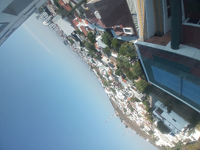 An aerial view showcases a cityscape bordering a body of water, likely the ocean, under a clear blue sky. The perspective is from an elevated position atop a building, revealing a tennis court on its roof. Below, houses and buildings with red-tiled roofs and green trees are densely packed along the landscape. In the distance, more buildings and potentially ships can be seen. The composition captures an urban scene set against the natural environment.