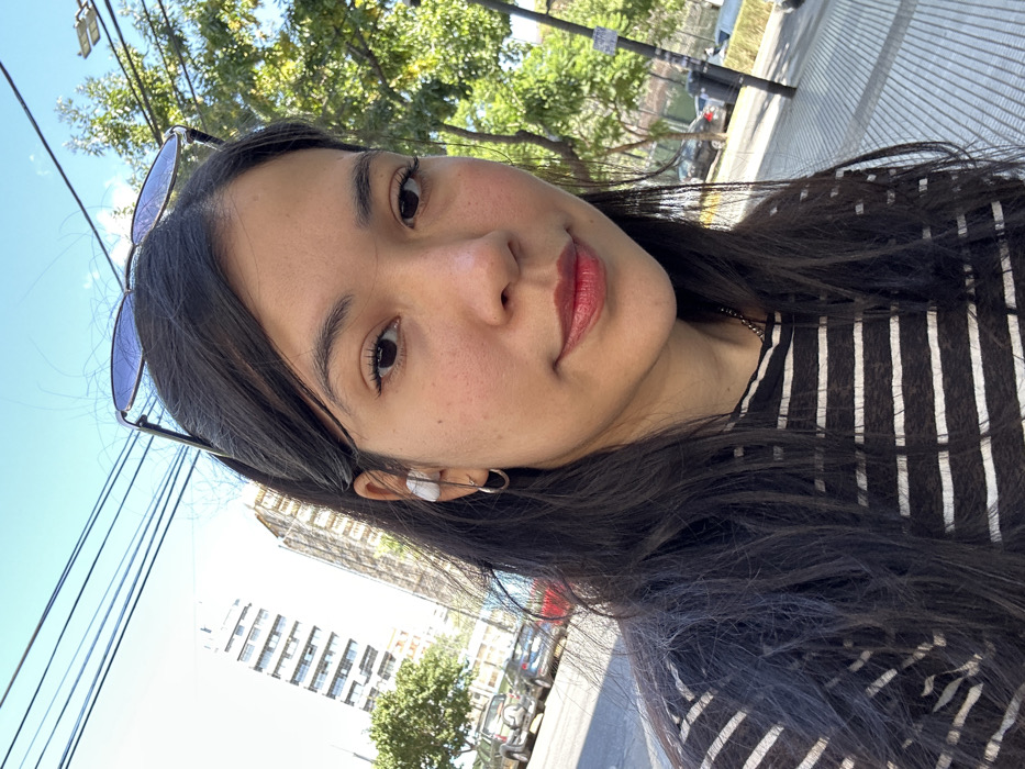 A young woman poses for a selfie outdoors. She is wearing a black and white striped shirt and has long dark hair. Sunglasses are perched on her head. She wears a large safety pin in her ear. Behind her, there is a city street with trees, buildings, and cars. The sky is blue.