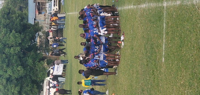 A sports team in blue and white uniforms stands on a grassy field