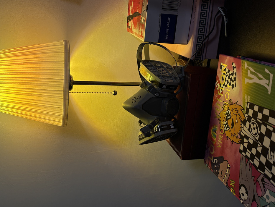 An interior scene in Hof HaCarmel Regional Council, Israel, depicts a table lamp illuminating a collection of objects on a surface. A table lamp with a pleated, light-colored fabric shade and a metallic stand emits a warm, golden-yellow light onto a plain, light-colored wall. A metal pull chain with a spherical finial hangs from the lamp fixture. Centered beneath the lamp is a gray 3M half-face respirator mask with detachable filters on each side, exhibiting an "M" initial marked on its forehead area. This mask rests on a dark reddish-brown wooden box. To the right of the mask, a stack of items includes a light-colored box with a Greek key pattern, topped by a white rectangular box labeled "MOUNT-VP01W" and featuring a barcode. In the immediate foreground, a large, open book displays colorful, cartoonish artwork and text, including "LOUIS VUITTON VIRGIL ABLOH," with a stylized lion-like character, checkerboard patterns, and the "LV" logo prominently featured. The surface supporting these items is dark and appears to be a desk or table. No individuals are present.