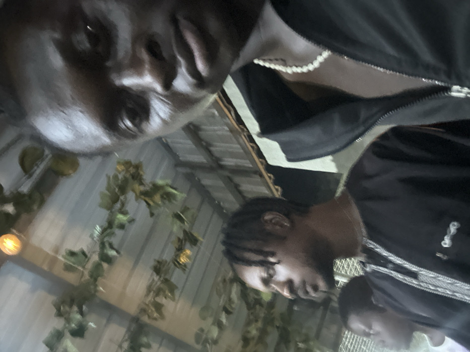 The image is a low-angle shot of three young Black men. The individual in the foreground is very close to the camera. The person to their right wears a pearl necklace and a black jacket with a zipper. In the background, there are string lights with greenery. The location appears to be outdoors, possibly an event or party setting. The image has a casual, selfie-style feel.