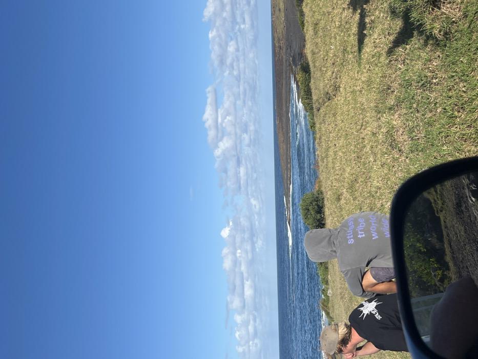 Two people are seen from the window of a car. One is wearing a gray hooded sweatshirt with "Stussy tribe world wide" printed on the back in purple. The other, wearing a black t-shirt, is looking down. The foreground shows a grassy area near a cliff, and the ocean is visible in the distance. A blue sky with fluffy white clouds fills the top left of the frame. The car's side mirror takes up the right side of the view.