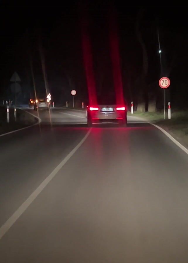 The video, shot at night, captures a dark, empty road illuminated by car headlights. The view is from behind a moving vehicle, focused on the tail lights of a car ahead. The road is marked with a solid white line down the center. Roadside signs, including speed limit signs (70 and 50), are visible on the right side. The overall environment is dark and rural, with trees flanking the road. The camera follows the car in front as it navigates a curve.