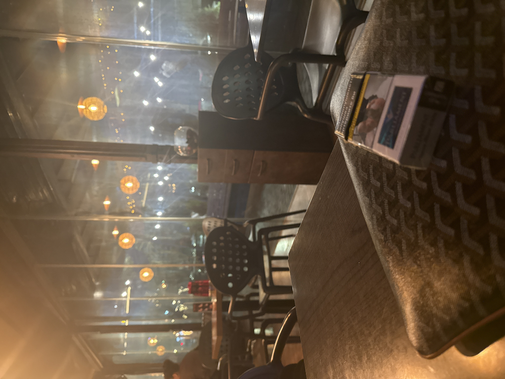 The image depicts the interior of a glass-enclosed establishment, likely a cafe or restaurant, at night in Burgas, Bulgaria. The perspective is from a seated position, looking across a dark wooden table. In the immediate foreground, to the right, rests a packet of "Parliament Aqua Blue" cigarettes on a dark object with a repeating pattern, possibly a wallet or table mat. The dark wooden table surface occupies the lower-left and central foreground. The midground features several dark tables and chairs. A prominent black chair with a perforated back design is visible in the center-right. Further back, a person is seated at another table, their back partially visible. A dark brown wooden cabinet or small dresser with three drawers is situated near the right side, topped with a spherical, reflective object. The background consists of a large glass wall, through which the nighttime exterior is visible. Several warm, spherical hanging lights, appearing as lanterns or decorative bulbs, are arranged throughout the interior space. Beyond the glass, numerous out-of-focus, bright lights indicate an urban environment, possibly a street or a lit outdoor area. The overall lighting is dim and warm, contributing to a soft, hazy atmosphere. No specific actions or interactions between individuals are discernible.