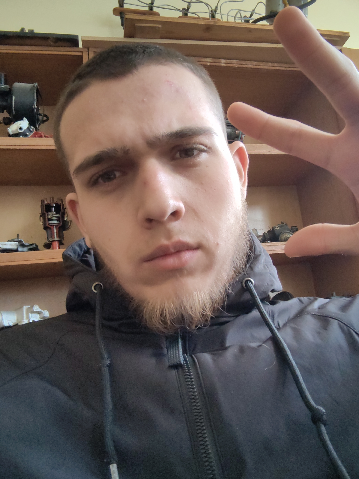The image presents a close-up, slightly high-angle indoor selfie of a young adult male. The scene is an indoor setting, specified to be within Sofia, Bulgaria. **Subject Description:** The male subject has short, dark hair, dark eyebrows, and brown eyes. His skin is light-toned with minor blemishes visible on his forehead. He exhibits a light brown or reddish-blonde goatee and chin strap beard, with minimal stubble on his cheeks. He is wearing a black, zippered hooded jacket, the hood drawstrings visible around the neckline opening. His facial expression is neutral to serious, with a direct gaze towards the camera. **Actions and Interactions:** The subject's left hand is raised in the upper right quadrant of the frame, forming a "peace" or V-sign with the index and middle fingers extended and separated. This gesture indicates the subject is actively engaging with the camera for a self-portrait. **Environment and Objects:** The background features a multi-shelf wooden unit, resembling a bookshelf or display cabinet, constructed from light brown wood. - On the middle shelf, to the viewer's left of the subject's head, is a black, cylindrical object, possibly a motor or pump, positioned next to silver-colored components. Further right on the same shelf, behind the subject's head, is a complex dark mechanical object, possibly a cutaway engine component like a distributor or carburetor, revealing internal parts in red and silver. - On the lower visible shelf, to the viewer's left of the subject's shoulder, are several white, irregularly shaped objects, possibly molds, castings, or product parts, arranged horizontally. - A portion of an upper shelf displays an arrangement of wires or tubes connected to various components, suggesting an electrical or pneumatic system. The wall behind the shelving unit appears to be a plain, light-colored surface. The overall environment suggests a workshop, study, or storage area containing various mechanical or industrial items.