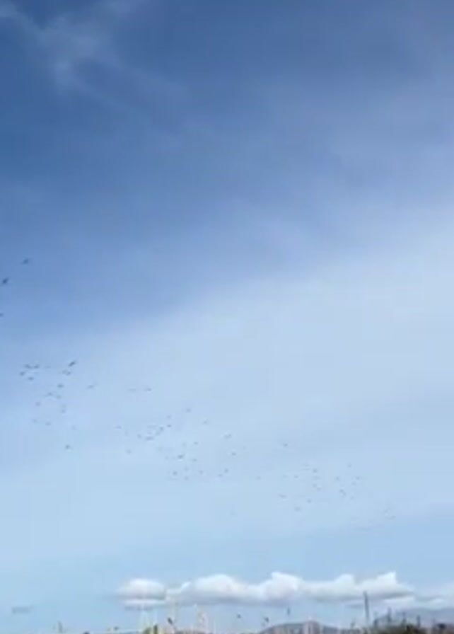 field of tall, dry grass and a fence in the foreground. Beyond the field, there is a low, grassy hill and what appears to be a small structure on top of it. Above the landscape, the sky is mostly blue with some scattered white clouds. A large flock of birds is seen flying across the sky, initially appearing as tiny dots, but as the video progresses, they become more discernible as birds. The birds are flying in a loose formation. The video appears to be taken from a stationary position.