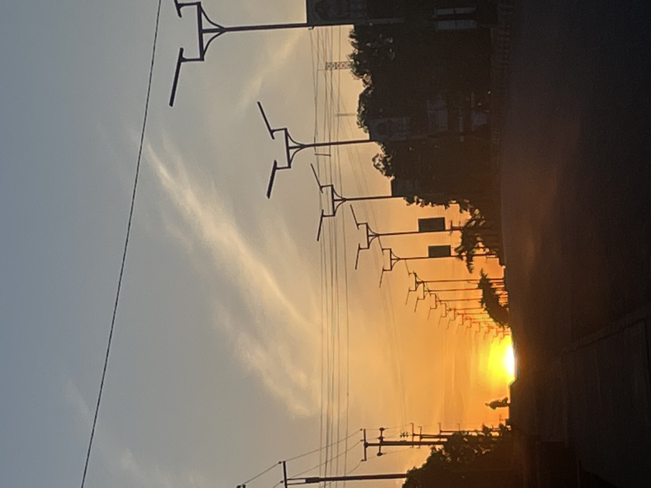 An eye-level shot shows a sunset over a road lined with tall, slender streetlights. The sky transitions from light blue-gray to a vibrant orange where the sun dips below the horizon. Power lines stretch across the sky, and dark silhouettes of trees and buildings appear on the right. The road is a dark, solid surface. The image is rotated counter-clockwise, giving it a tilted perspective.