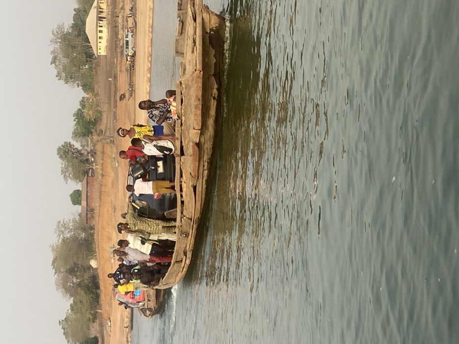 A wooden boat crowded with people, including one in military uniform, and a dark car is crossing a body of water. The aged boat is made of rough wood planks. Reflections ripple on the water's surface. In the background, a tan landscape features a building and trees under a hazy sky. The scene appears to be a local ferry transporting people and vehicles.