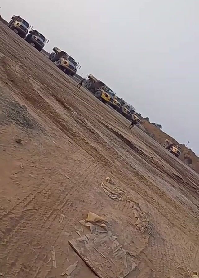 line of large yellow mining trucks parked on a muddy, sloped surface under an overcast sky. The trucks are facing uphill and appear to be stationary. A person is walking between the trucks. The ground is covered in tire tracks and debris, including a rectangular piece of material. The perspective is from a slightly lower angle, looking up at the trucks.