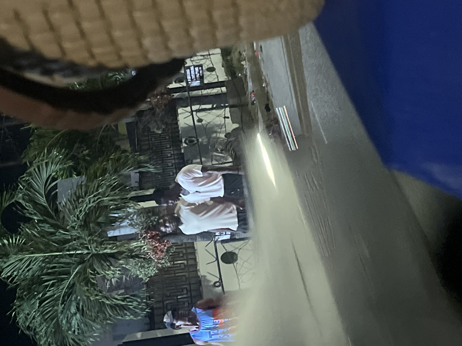 A nighttime shot features two people in white shirts standing in a garden setting. A palm tree and a brick wall with decorative metalwork are visible in the background. A third person wearing a blue shirt and glasses is seen in the foreground. The scene is partially obscured by an object at the top of the frame, and a bright, blurred streak cuts through the center, likely a light source. The image appears to be taken from a high vantage point.