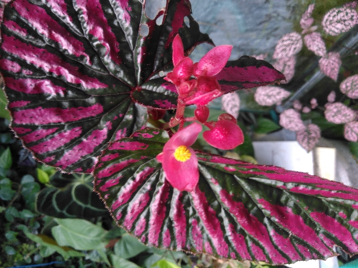 The image displays a close-up, top-down view of a cultivated plant identified as a Begonia, located in the city of Otta, Norway. The central focus is on two large, dark green leaves exhibiting prominent, irregular stripes and patches of vibrant fuchsia or magenta coloration. The leaf margins are slightly serrated, and one leaf in the upper right quadrant shows minor lacerations or holes. A cluster of small, bright pink flowers with distinct yellow centers is situated in the middle right portion of the frame, with one flower fully open and others appearing as buds or partially open. In the blurred background, to the upper left, are various green leaves from other plants. To the lower right, also out of focus, are numerous smaller plants with light pink and green speckled leaves, likely *Hypoestes phyllostachya*. A white, rectangular object and a darker, possibly metallic, bar are visible in the blurred lower mid-ground, indicating a structured planting environment such as a greenhouse or a planter. No human figures are present.