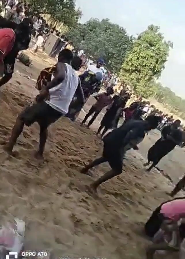 group of people dancing in a sandy area, possibly a beach or a clearing with sandy ground. They are moving rhythmically, some with more defined steps than others. A crowd of people surrounds the dancing group, observing the performance. There are trees in the background, suggesting an outdoor location, and the lighting indicates it is daytime. Some garbage is visible in the foreground. The camera's orientation shifts during the video, providing different perspectives of the scene.