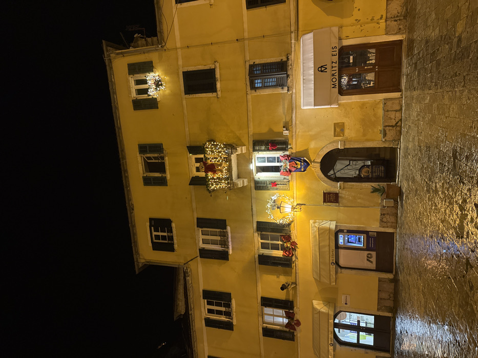 A yellow building at night, decorated with Christmas lights and wreaths on the windows and balcony. A "Moritz Eis" sign hangs above the entrance. An ATM is visible near a doorway. The street appears wet, reflecting light from the building. The windows have dark shutters. The building has a traditional architectural style.