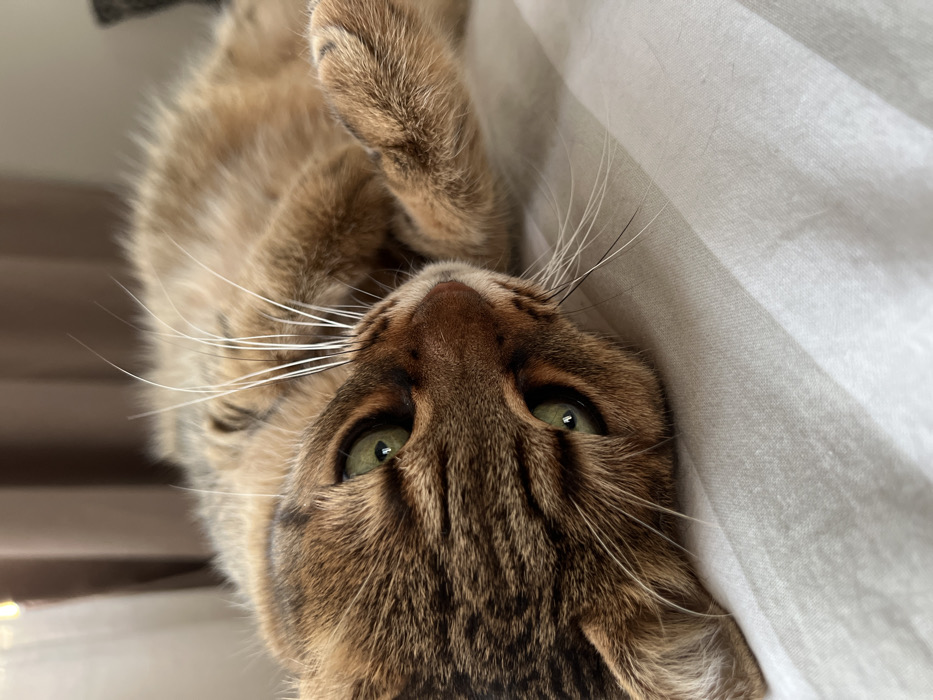 - "An adult domestic shorthair cat with a brown and tan mackerel tabby coat, exhibiting prominent darker brown stripes on its head and body, is depicted lying on its left side" by FM-XA2Is1, licensed under CC BY 4.0