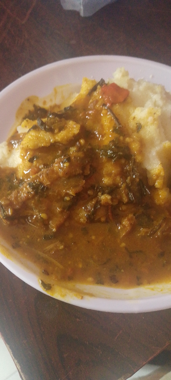 A white, round bowl containing a meal is positioned on a dark brown wooden surface, likely a table or countertop. The meal consists of a white, lumpy, starchy staple food, occupying the right side of the bowl. This staple is partially covered by a thick, orange-brown stew or sauce. The sauce contains dark green leafy vegetables, reddish pieces, and other textured fragments, possibly meat or fish, indicating a hearty preparation. The wooden surface displays a visible grain pattern. No individuals, actions, or interactions are present. The scene is located in the city of Unknown, Unknown.