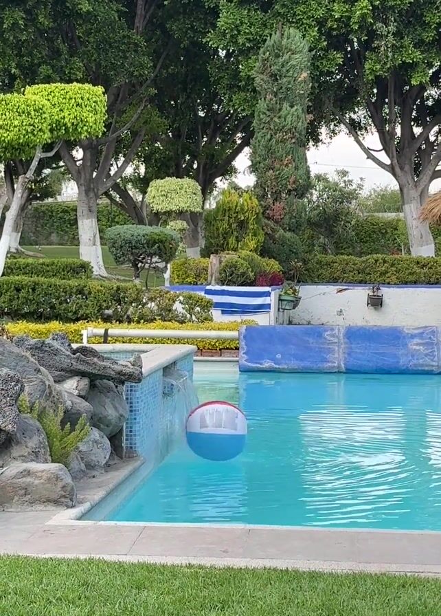 still shot of a bright blue swimming pool, with a beach ball floating in the center. The beach ball is a mix of blue, red, and white colors. The pool is surrounded by green grass and a variety of well-maintained trees and bushes. The landscaping is manicured, creating a serene and peaceful environment. The pool has a rock feature and blue and white tile accents. In the background, there's a wall with blue and white decor.