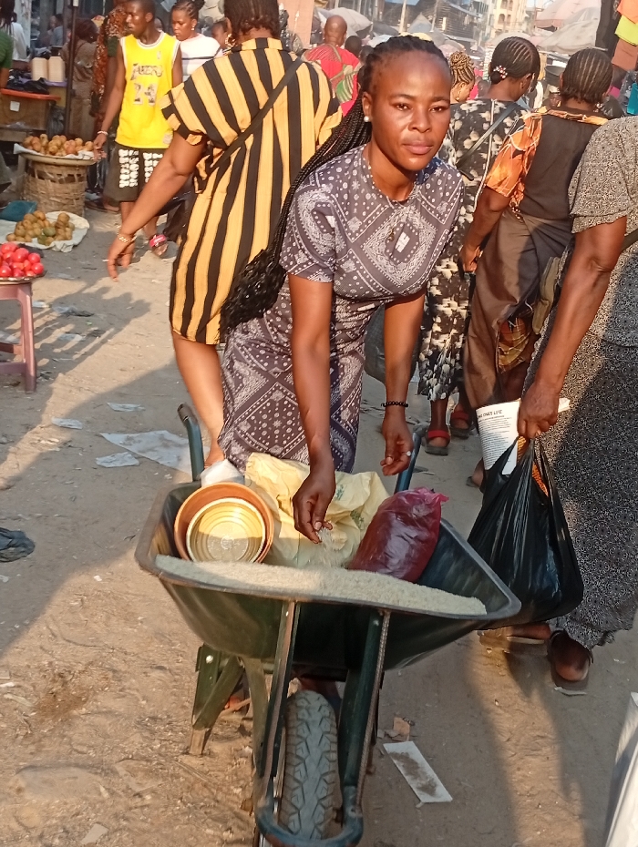 A woman with braided hair stands behind a wheelbarrow filled with goods, including rice, bags, and bowls