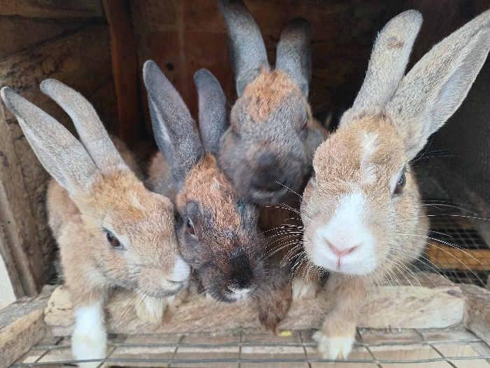 - "Four rabbits are contained within a wooden enclosure with a wire mesh front or floor, located in Ibadan, Nigeria" by FM-5XlVe2, licensed under CC BY 4.0