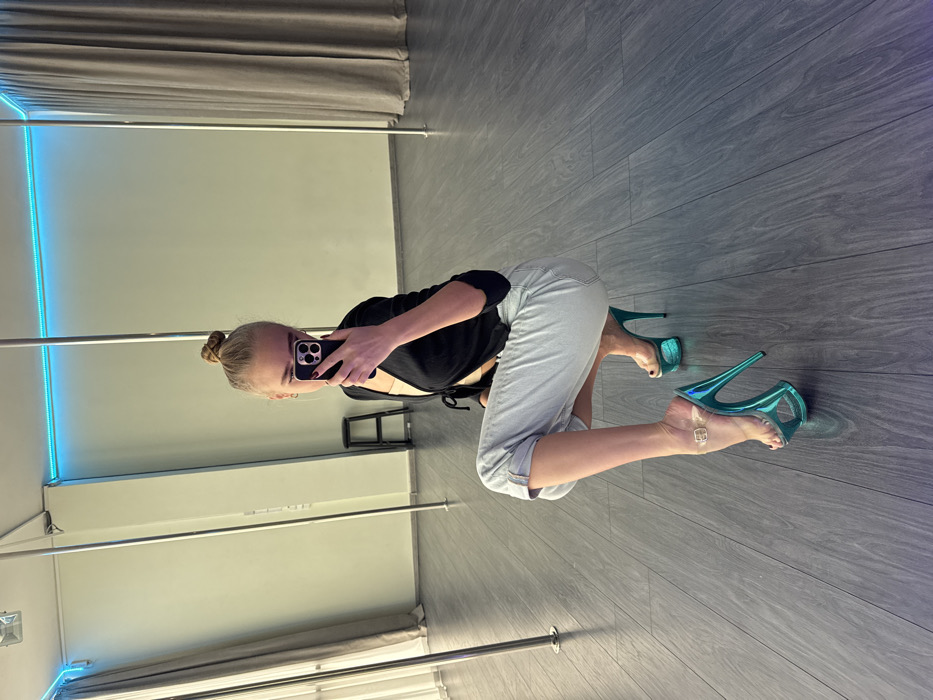 An indoor scene depicts a young adult female in a squatting position within a dance or pole fitness studio, located in Unknown, Unknown. The female, with blonde hair tied in a high bun, is taking a mirror selfie with a dark-colored cell phone held in her right hand, partially obscuring her face. She wears a black short-sleeved wrap-top over a light undergarment, light blue cropped denim jeans, and iridescent teal platform high heels with clear ankle straps. Her left foot is partially out of its shoe, while her right foot is fully inserted. The background features multiple chrome vertical poles, light-colored walls, a dark backless stool, and light-colored curtains along the right side of the frame. A strip of blue LED lighting is visible near the ceiling on the right. The floor is dark grey wood-laminate.
